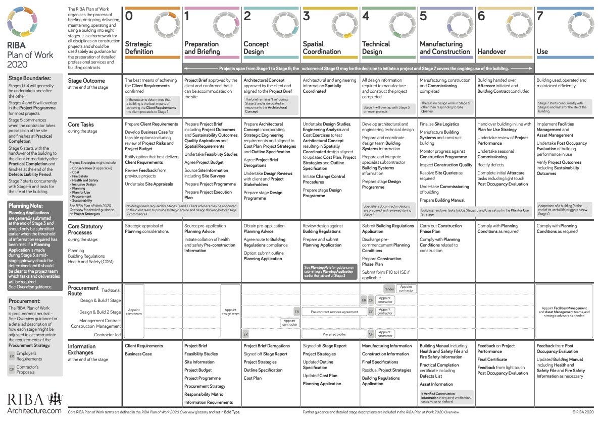 - The RIBA Plan of Work 2020 is a guidance document set out by the Royal Institute of British Architects, designed to serve as the definitive design and process management tool for the UK construction industry.